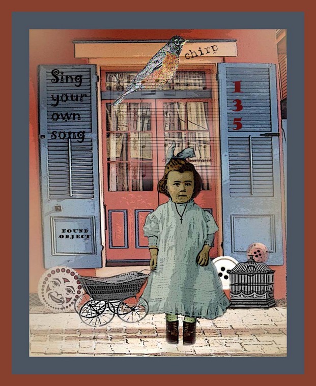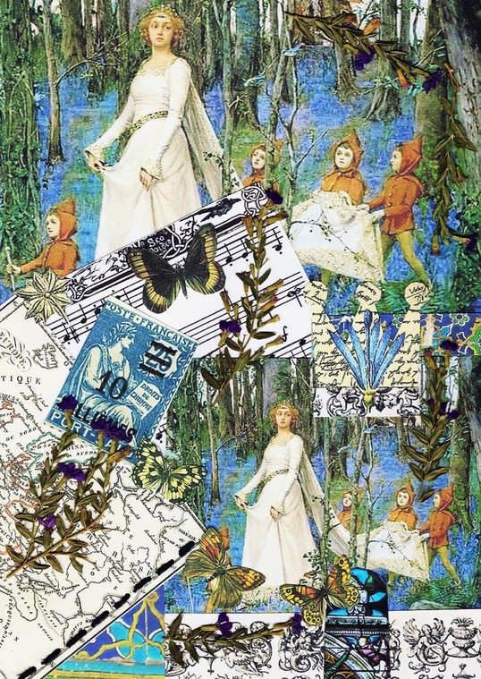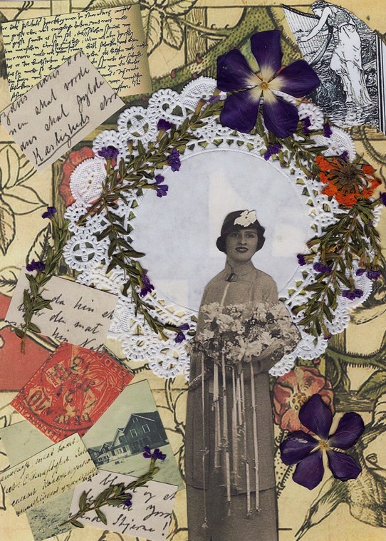 created from a vintage wallpaper pattern. The piece also includes a paper doily,commercial papers, and pressed flowers.