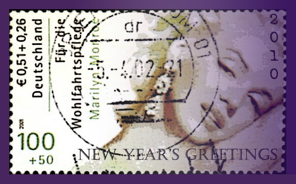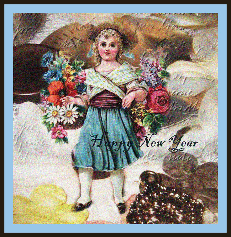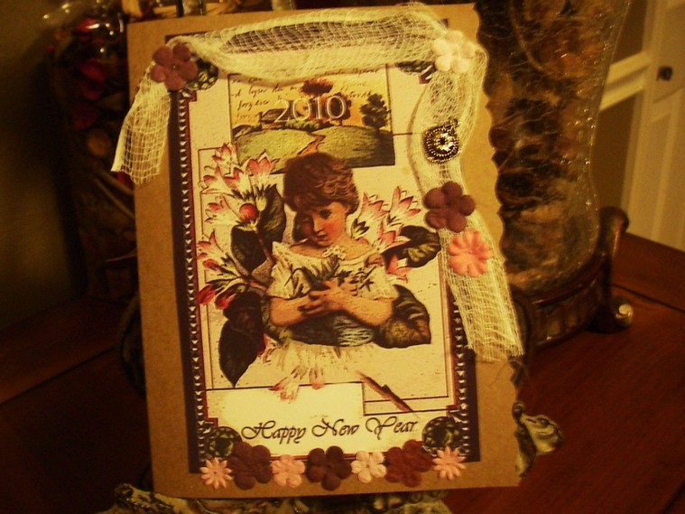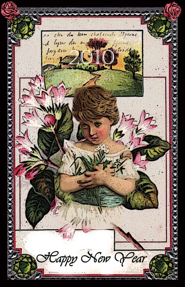 For this work, I first created it digitally (left)with images from The Graphics Fairy and then crafted a vintage card using the New Year's piece (right.)