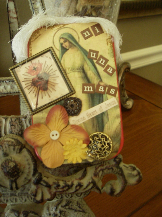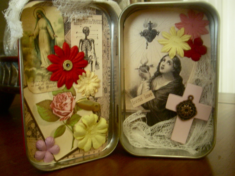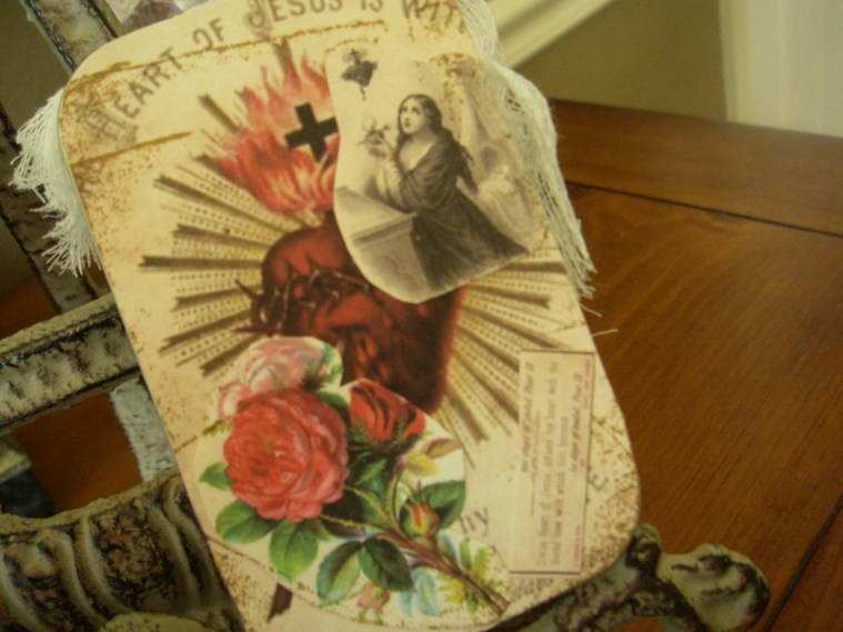 images are actually antique prayer cards. A pink wooden cross rests inside the