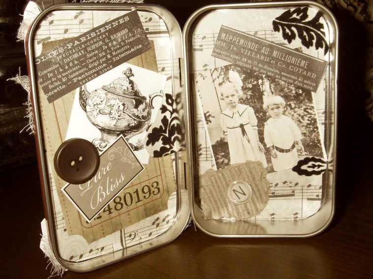 It is made with commercial papers and embellishments, as well as images from the Graphics Fairy, Vintiquities, and Bloggerette Sorority.