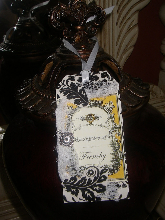 I love to hang tags in various areas of my home. This personalized tag was created as a gift for Frenchy! It was made with an image from the Graphics Fairy, as well as commercial papers