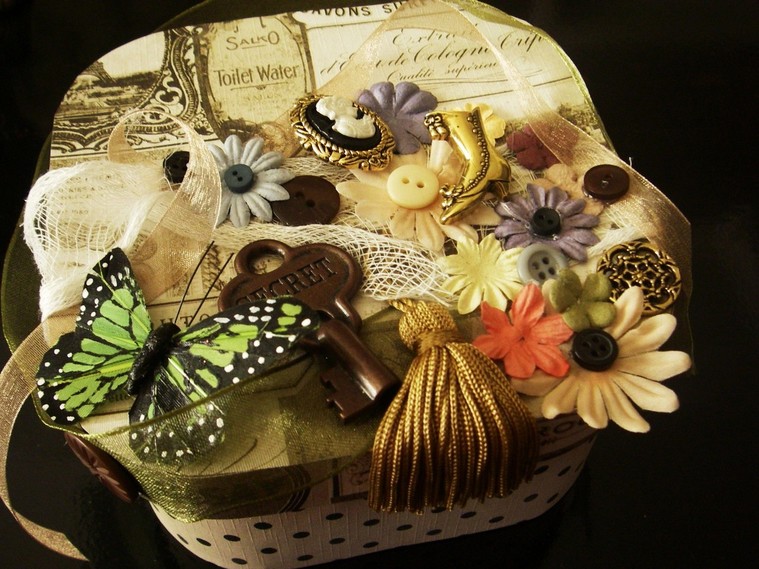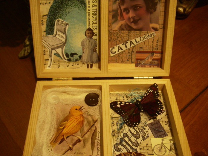 tin or wooden box, turn it on its side and decorate it inside. You can add silk flowers, vintage keys and images, or whatever holds special meaning for you. It is the perfect place to add quotations that are uplifting.