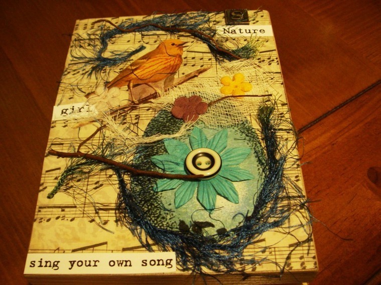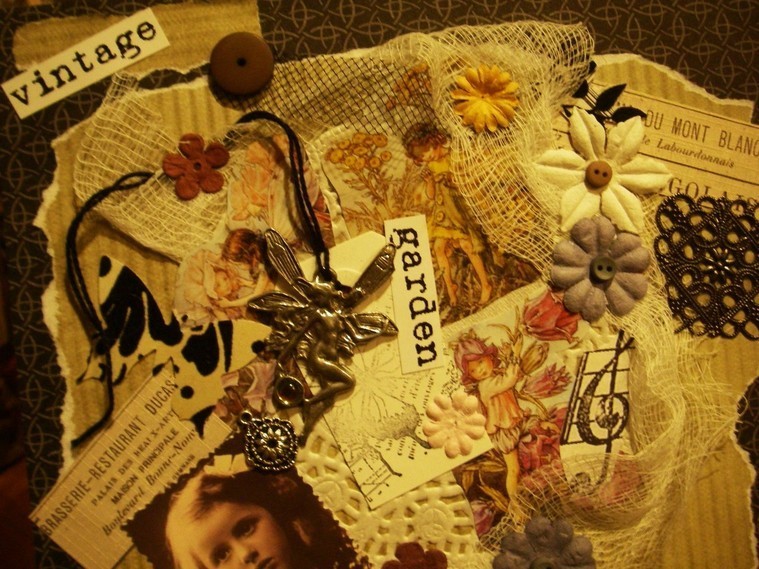 buttons, cheese cloth, other images, yarn, embellishments and Prima flowers. Twigs from