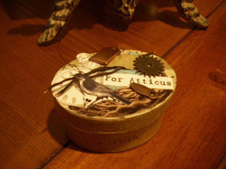 This miniature box was created for a young man named Atticus. Twigs from a real bird's nest adorn the lid, along with commercial embellishments and images.