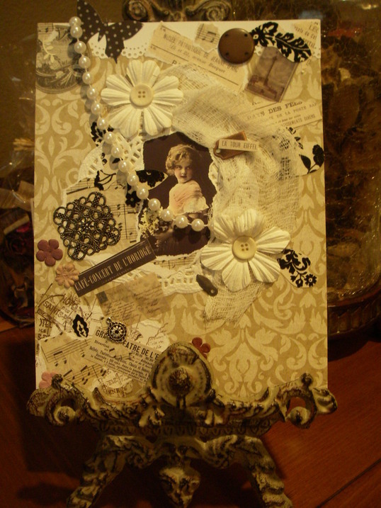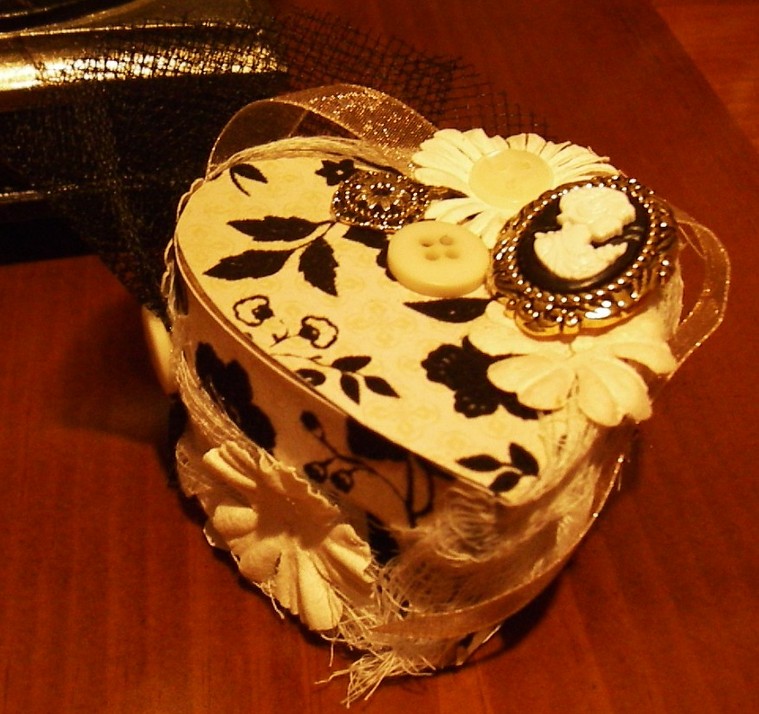 young lady named Courtney in celebration of her recent engagement. It was created in creme and black using commercial papers, embellishments and buttons. Also includes Prima flowers, cheesecloth, tulle, and ribbon.