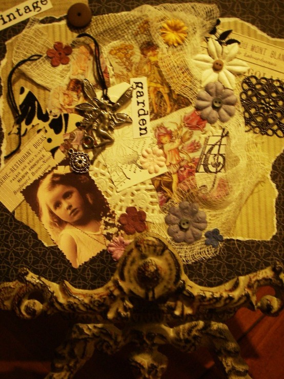 This 8 x 8 piece was created as a gift for a young lady named Chloe whose vintage style was the inspiration for this work that includes commercial images, papers, and embellishments, including a metal garden fairy. The little girl image is from Last Door Down the Hall.