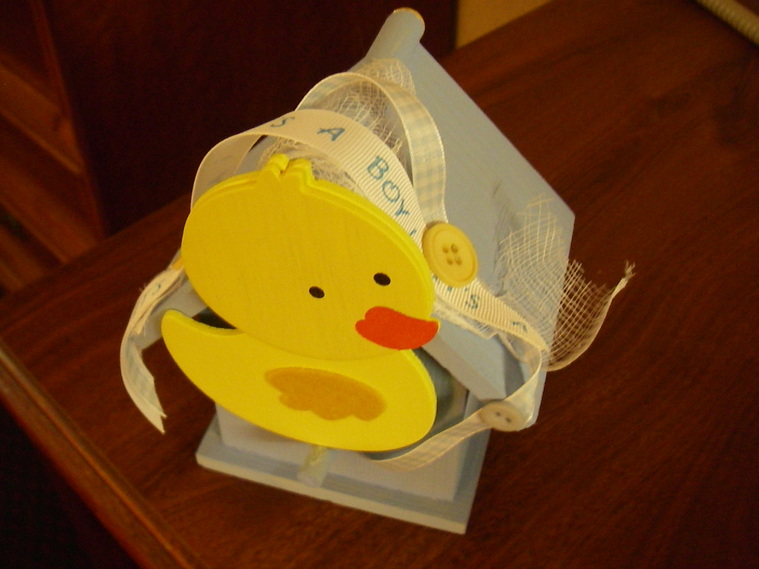 home on this birdhouse with an "It's a Boy" ribbon announcing the birth of this new bouncing
