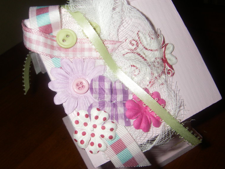 They are embellished with commercial stickers, buttons, and also Prima flowers.