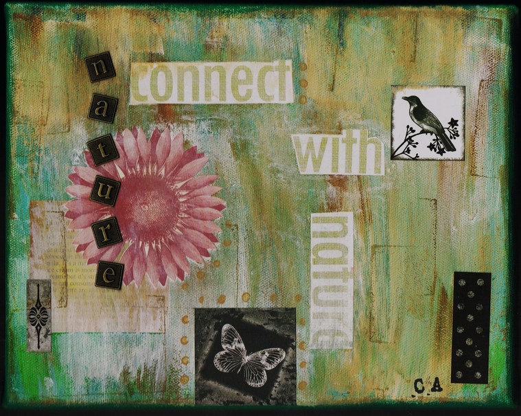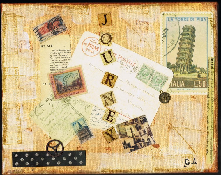 Acrylic and gesso with commercial rubber stamps, papers, and embellishments on stretched 8x10 canvas. Gold-colored edges.