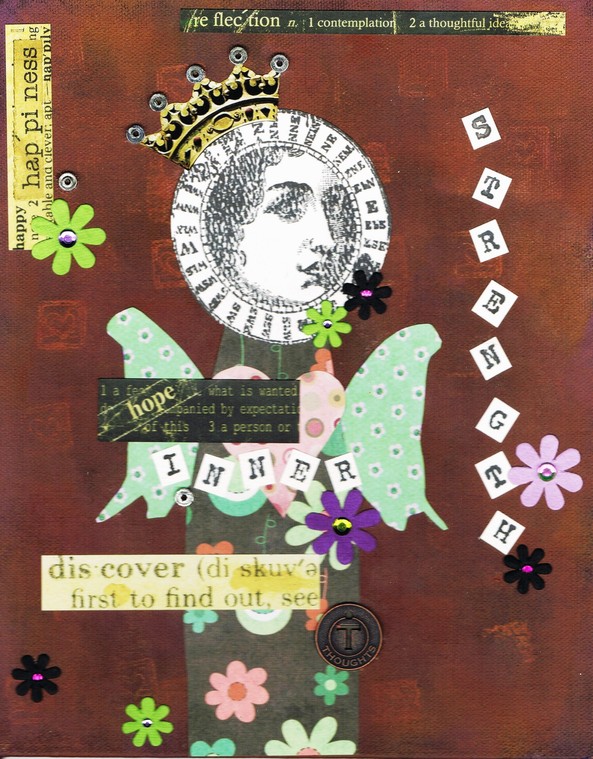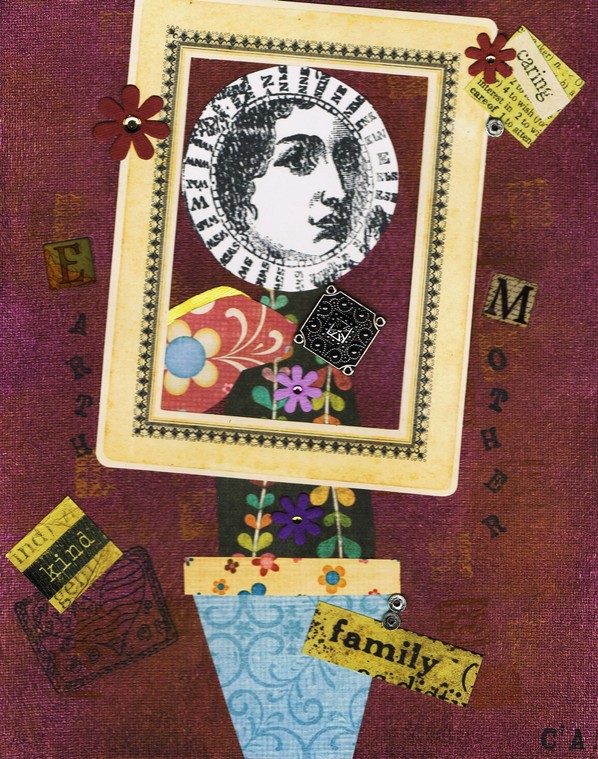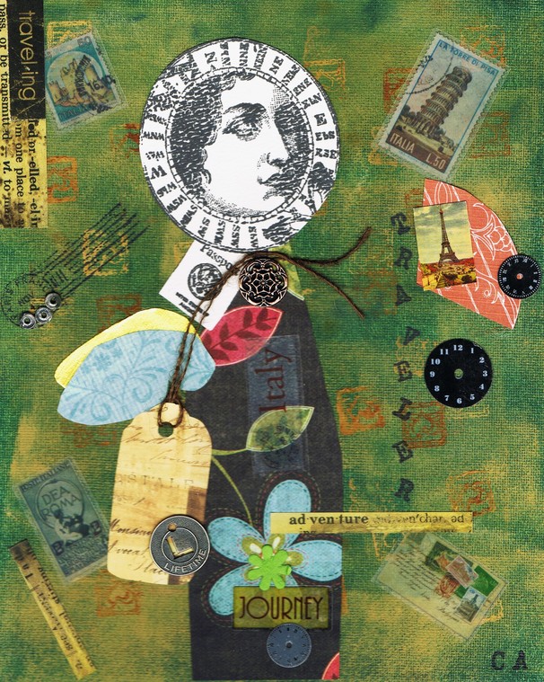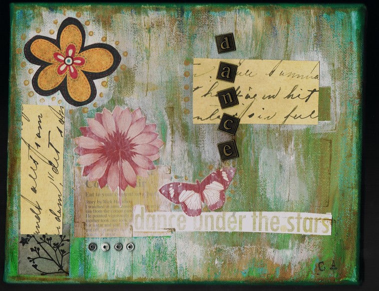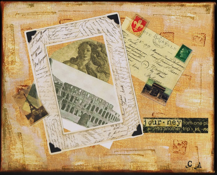 Acrylic and gesso with commercial rubber stamps, papers and embellishments on stretched 8x10 canvas. Gold-colored edges.